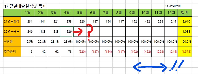 제가 월별 매출 목표를 세워 보라고 지시를 하였는데, 엑셀에서 셀 이동이 안된다고 하더군요.