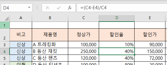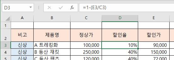 [형광*(정상가 - 할인가) / 정상가 = 할인율*]