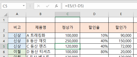 | 판매단가 | 할인금액 / (1 - 할인율) |