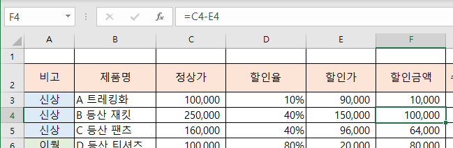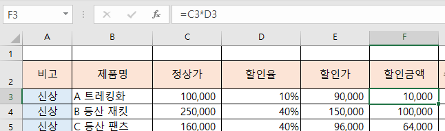[형광*정상가 - (정상가 * 할인율) = 할인가*]